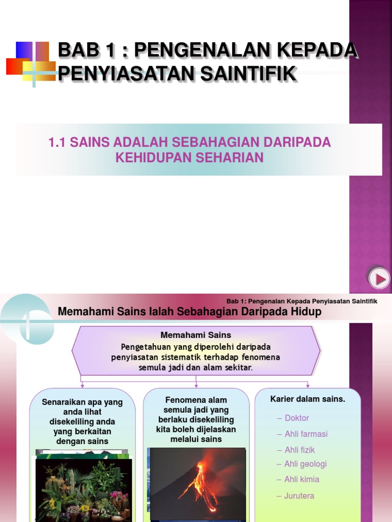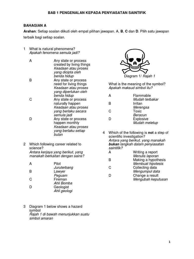 Set soalan ini dihasilkan untuk menguji kefahaman pelajar. Nota sains tingkatan 1 bab 1 : Apakah sikap saintifik dan nilai murni yang perlu diamalkan oleh seorang ahli sains? Pengenalan kepada penyiasatan sainstifik apa itu sains? > sains ialah disiplin ilmu yang melibatkan pemerhatian dan eksperimen yang sistematik terhadap fenomena alam semula jadi.