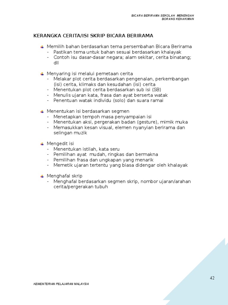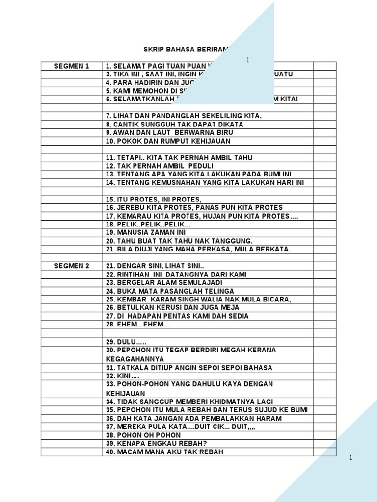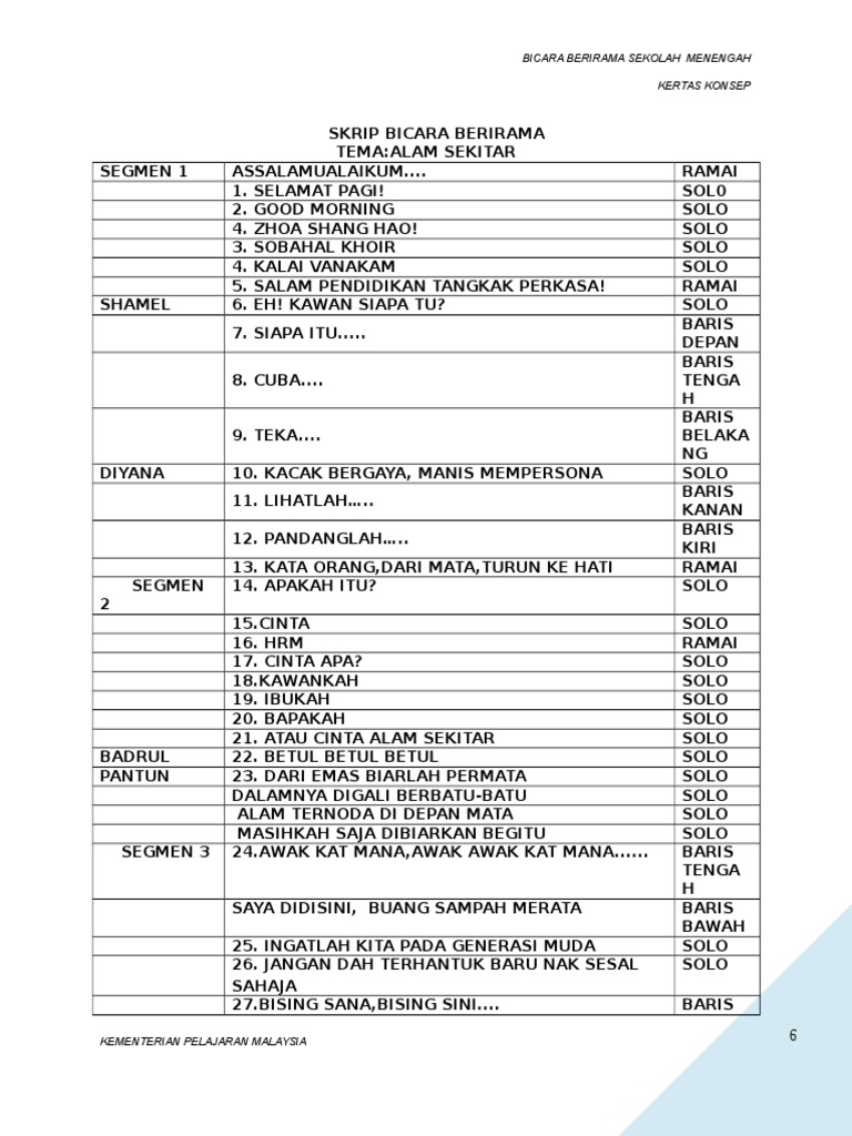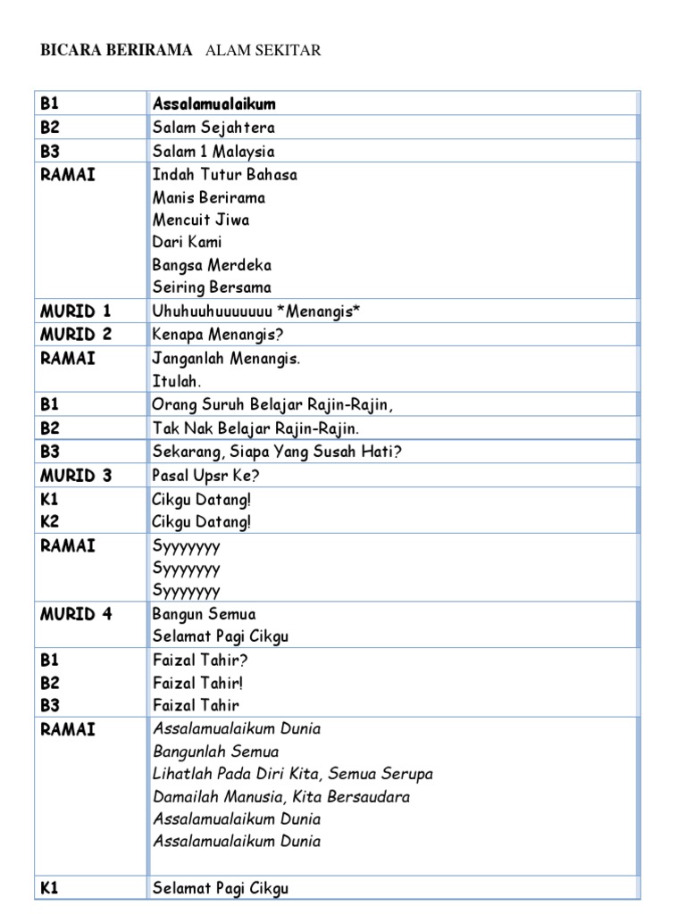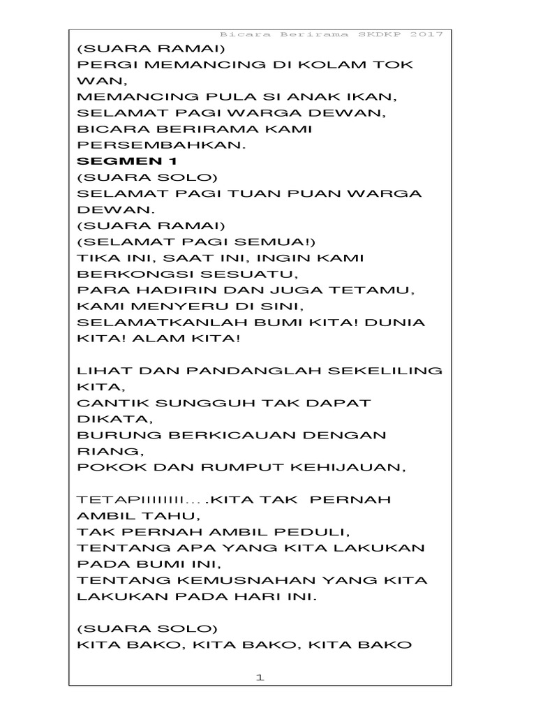 Skrip Bicara Berirama Alam Sekitar : Malah kita patut menjaga baik budi pekerti untuk mencapai kejayaan.. Setiap individu dan rakyat di negara ini perlulah memainkan peranan penting. Terdapat beberapa cara yang boleh dilakukan oleh masyarakat untuk menjaga kebersihan alam sekitar. Skrip bicara berirama sekolah menengah sungai bayor. Malaysiaku gemilang marilahkita semua atasnama negara bangsa dengantekadmulia maju berwawasan menciptakeagungan berpadulahkitasemua di dalamsatu suara dengandegupanmerdeka menjulangbudayabangsa untuk malaysiatercinta malaysiakugemilang. Seharusnya sebagai manusia kita mestilah ada sikap bertanggungjawab dalam diri sendiri dan juga alam sekitar.