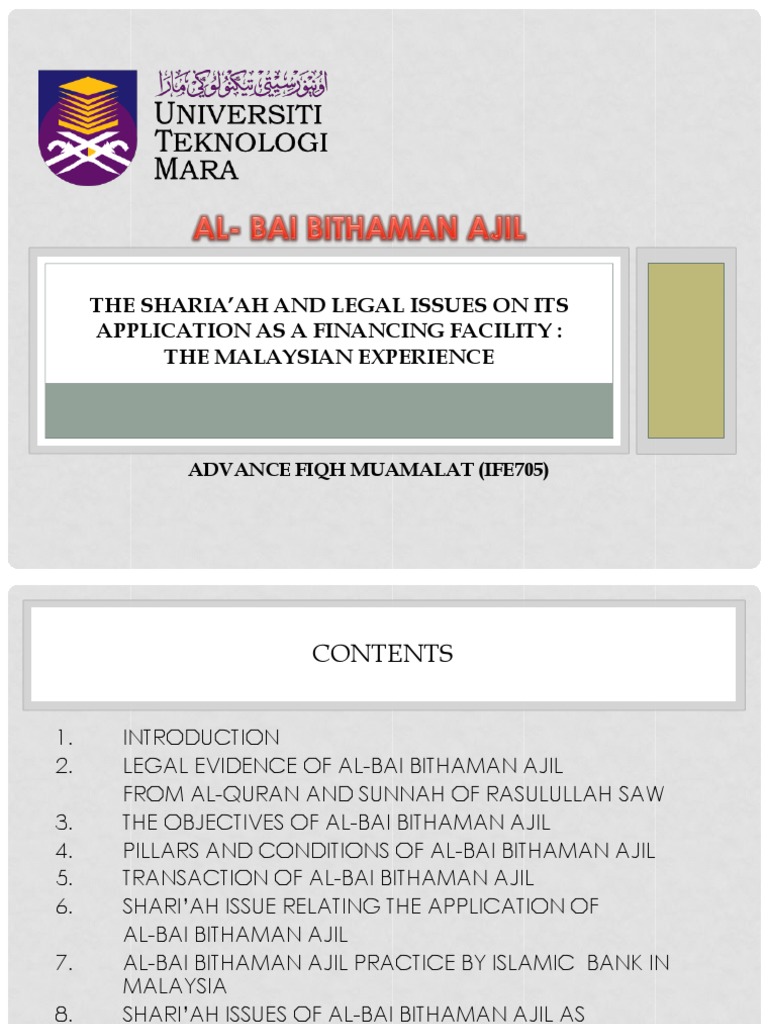 Al Bai Bithaman Ajil - Syariah and legal issues - the ... from image.slidesharecdn.com A bai' bithaman ajil is used under a type of facility that deals with islamic finance. It argues that the current practice of bba is nothing more but a legal device. The study emphasises on the need to comply with the existing legal framework and execute relevant contracts in line with the. The star, malaysia, contributed by bank negara. Some islamic financial products have been created and applied well in this country in accordance with the shariah principle. News related to bai bithaman ajil (591). The bba is a deferred installment sale where bank capitalizes on its profit up front in the sale of property. Dispute between bank and customer in bai bithaman ajil (bba).