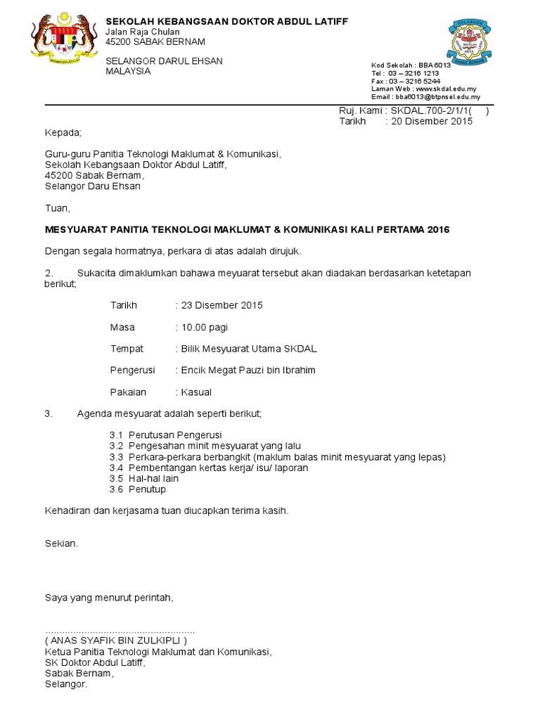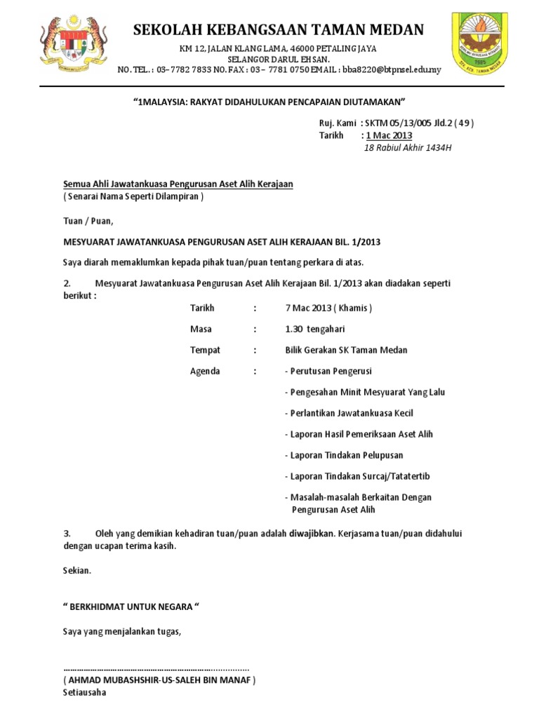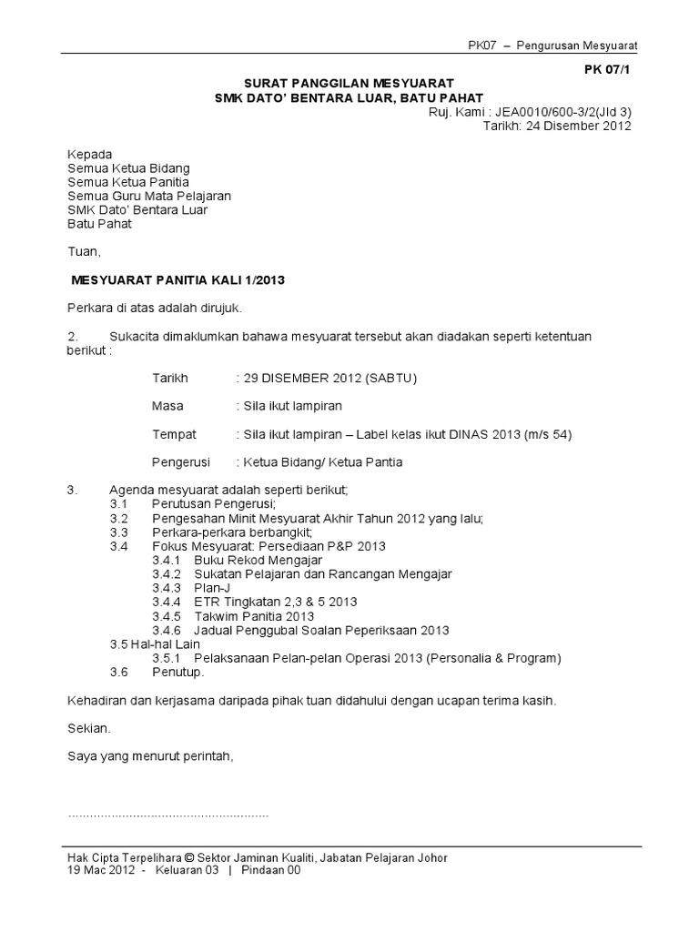 Salah satu peraturan yang harus dipatuhi ialah perihal absensi setiap hari kerja. Surat resmi terdiri dari kop surat, nomor, lampiran, perihal, serta adanya tanda tangan dan stempel khusus. 3 julai 2013 kepada, ( jawankuasa kerja ) tuan/puan, mesyuarat ajk kerja bulan kecergasan tahun 2013 dengan segala hormatnya perkara di atas adalah dirujuk. Ya, surat panggilan ini biasanya ditujukan kepada orang orang yang melanggar peraturan. Berjumpa lagi dengan saya hari ini untuk kembali membagikan contoh surat terbaru untuk anda semua. 3 julai 2013 kepada, ( jawankuasa kerja ) tuan puan contoh panggilan mesyuarat seperti apa apa kepentingan dalam mana mana syarikat atau pengusahaan yang dengannya lembaga pengarah. Jangan sampai dokumenmu ditolak karena salah buat! Perjalanan dinas dalam melakukan pengiriman barang, maka diwajibkan bagi pihak pengirim untuk membuat surat jalan agar barang yang dikirim lebih jelas secara detail. Surat panggilan mesyuarat j qaf. Surat ini termasuk surat resmi yang digunakan oleh perusahaan untuk melakukan panggilan interview kepada pelamar. Contoh surat panggilan kerja adalah surat yang dibuat dan dikirimkan oleh perusahaan kepada seorang pelamar kerja sebagai informasi bahwa pelamar tersebut. Yang akan menjadi materi pembahasan kita kali ini adalah mengenai contoh surat keterangan usaha (sku). Pk07 pengurusan mesyuaratpk 07/1 surat panggilan mesyuarat ruj.